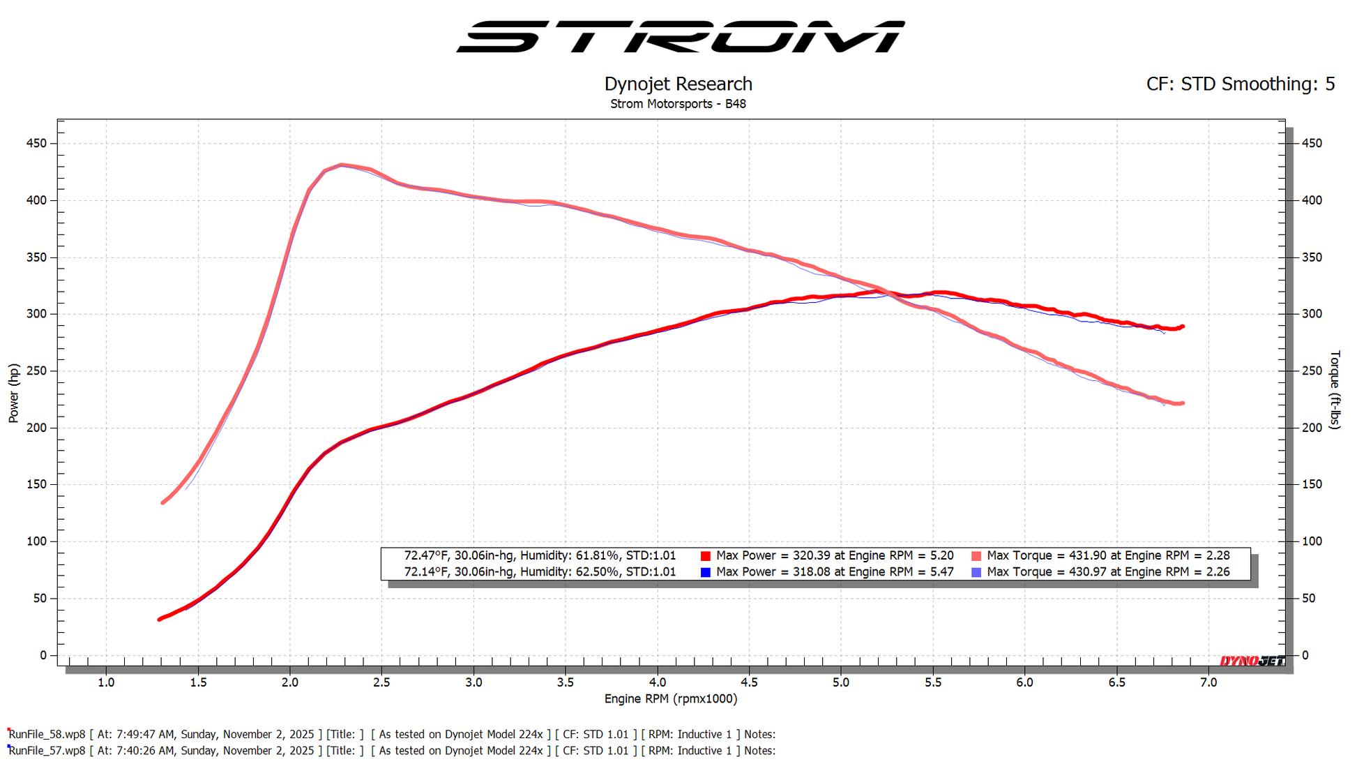 390hp/520lbft bhp on E85 - 320whp and 430 lbft wheel horsepower on a dynojet