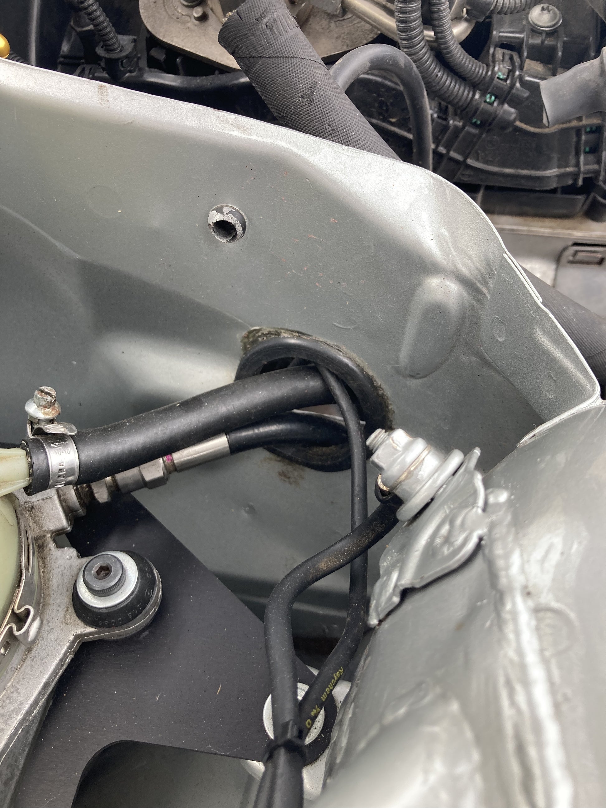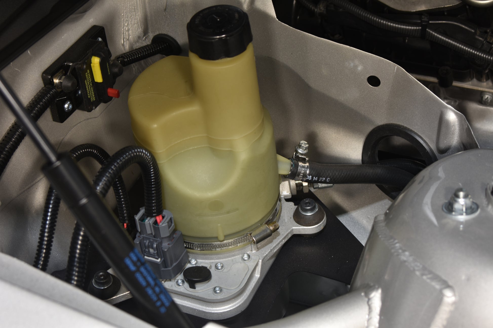 Mounts a Volvo Power Steering Pump in the passenger side cubby of the engine bay on an E46. Includes CNC bent stainless hard lines, soft lines, fittings and mounts.