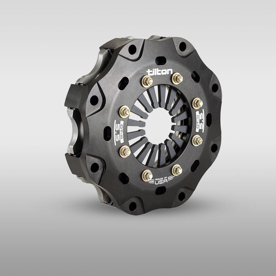 Tilton’s 5.5″ OT-III metallic racing clutches offer the low moment-of-inertia, high torque capacity and reliability necessary for the most demanding racing applications. These features have made metallic clutches the most common clutch type used in road racing and circle track racing. The included high ratio pressure plate features short release travel for quick engagement and shifting as well as a flat clamp load curve for longer wear range. 5.5″ OT-140 metallic racing clutches are not recommended for street use.